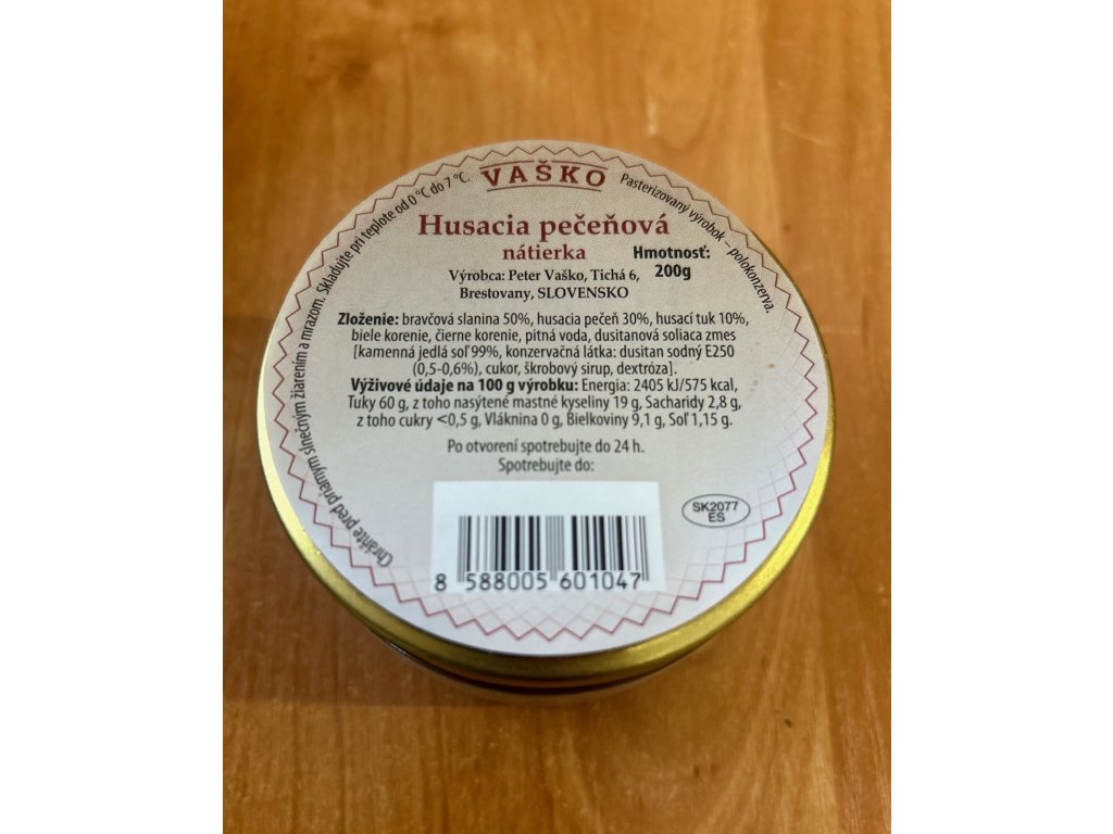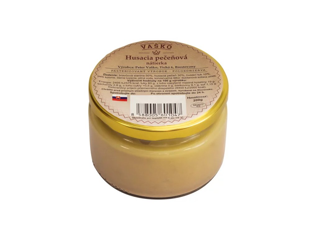 Poctivá husí játrová pomazánka připravená podle tradiční receptury. Kombinace jemných jater, slaniny a husího tuku vytváří delikátní chuť, která se rozplývá na jazyku.