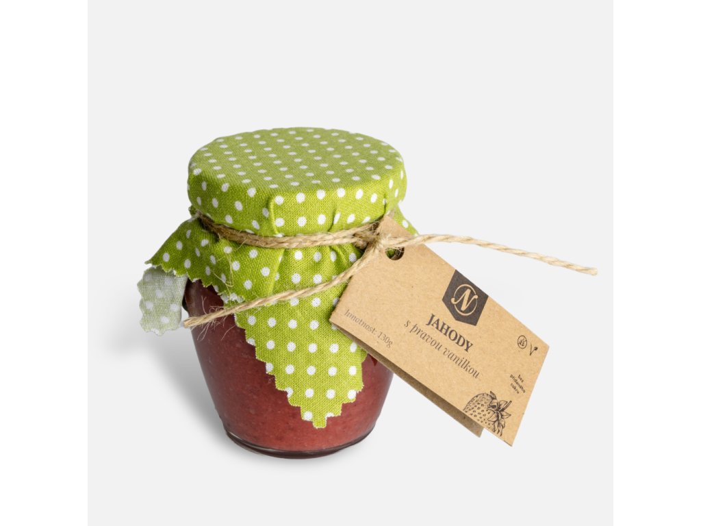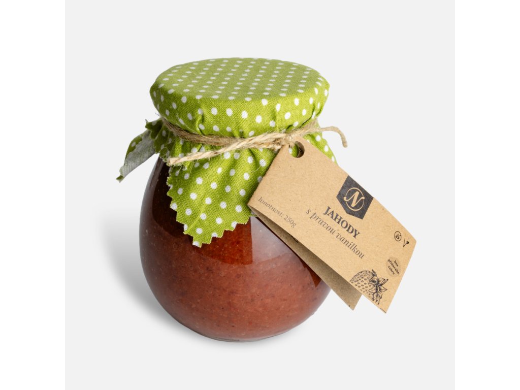 Jahoda s pravou vanilkou – Marmoleta bez přidaného cukru, jemná chuť zralých jahod s nádechem pravé vanilky. Čistý chuťový zážitek ideální k pečivu nebo dezertům.