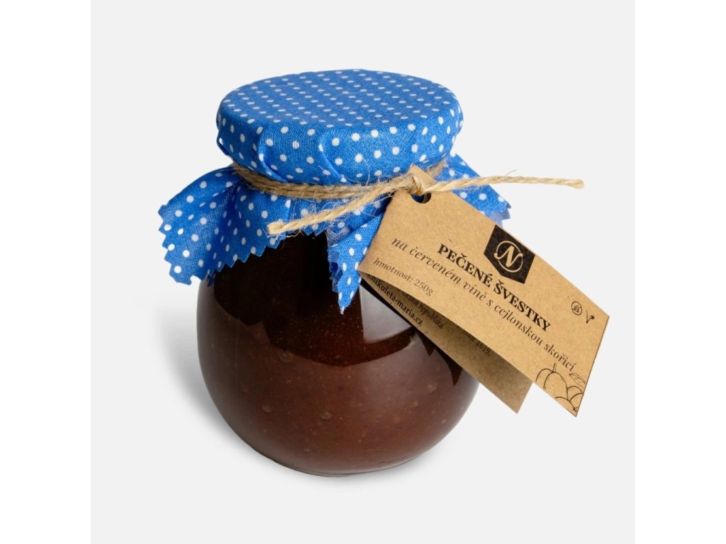 Marmoleta Pečené švestky na červeném víně nabízí bohatou chuť švestek, jemně doplněnou červeným vínem a lehkým nádechem citronu. Tento produkt je skvělý jako doplněk k sýrům, masům nebo na pečivo a dodá pokrmům lahodně plnou ovocnou chuť. Vyrobeno s láskou v ČR, bez umělých konzervantů.